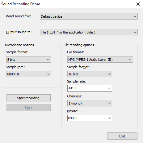 Esta demostración muestra cómo grabar sonido desde el dispositivo de entrada de audio especificado (micrófono) y reproducirlo en el dispositivo de salida de audio especificado (altavoces) o grabar en un archivo.