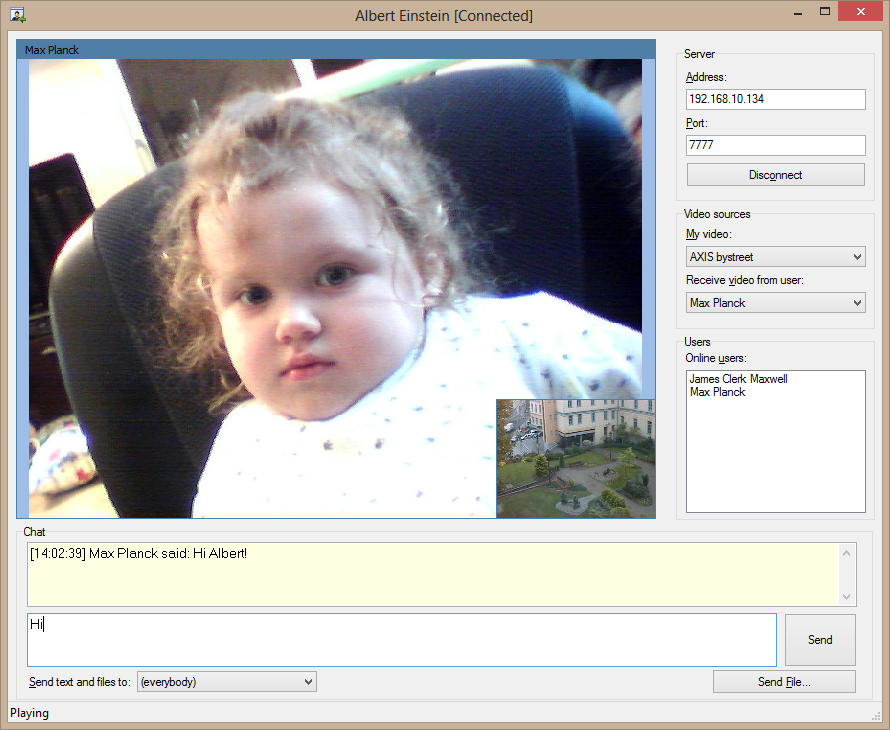 Estas aplicaciones se conectan a una demo de servidor multimedia (vea más arriba) y pueden enviar entre sí datos de vídeo, sonido del micrófono, archivos y mensajes de texto.