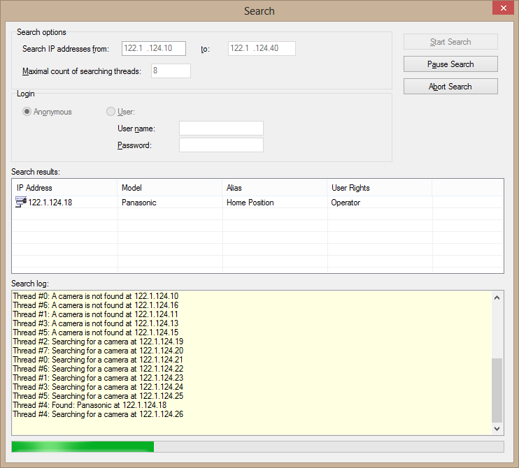 En este ejemplo se realiza una búsqueda de cámaras en un rango especificado de direcciones IP.
