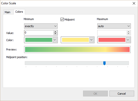 Se puede encontrar una característica similar en algunas aplicaciones de hoja de cálculo (como Microsoft Excel), pero en Report Workshop puede definir no solo los colores, sino también la escala de opacidad.