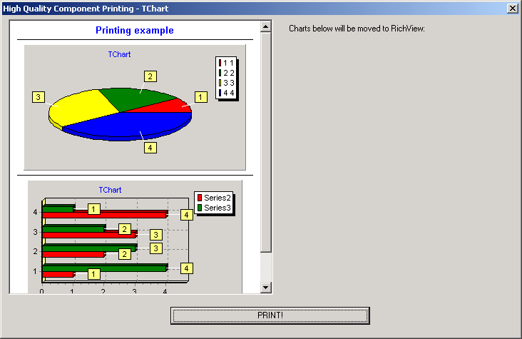 Por defecto, TRichView imprime controles insertados usando un Bitmap temporal proporcionado por el programador en el evento OnPrintComponent. Esta técnica no puede asegurar una imagen con alta calidad puesto que el Bitmap tiene la resolución de la pantalla, que es generalmente mucho más baja que la resolución de la impresora. Este plugin hace la impresión con alta calidad de los componentes TChart insertados en el editor o en el visor de RichView. Un buen ejemplo de cómo implementar la impresión para tipos personalizados de controles esta en el Demo incluido.