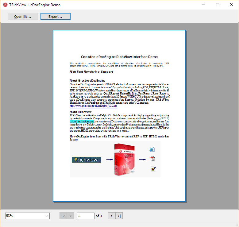 eDocEngine de Gnostice convierte documentos de TRichView a PDF, XHTML, Excel, Quattro Pro, Lotus 1-2-3, DIF, SYLK, SVG (XML gráficos basados en vectores),